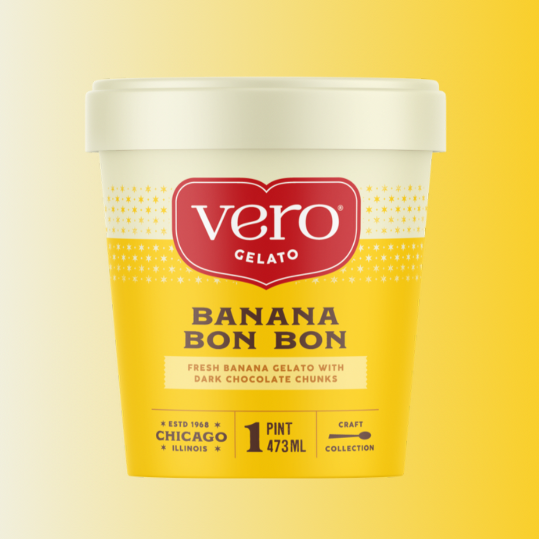 Decadent gelato with fresh bananas blended in to make a creamy, banana gelato base with chocolate chunks swirled in