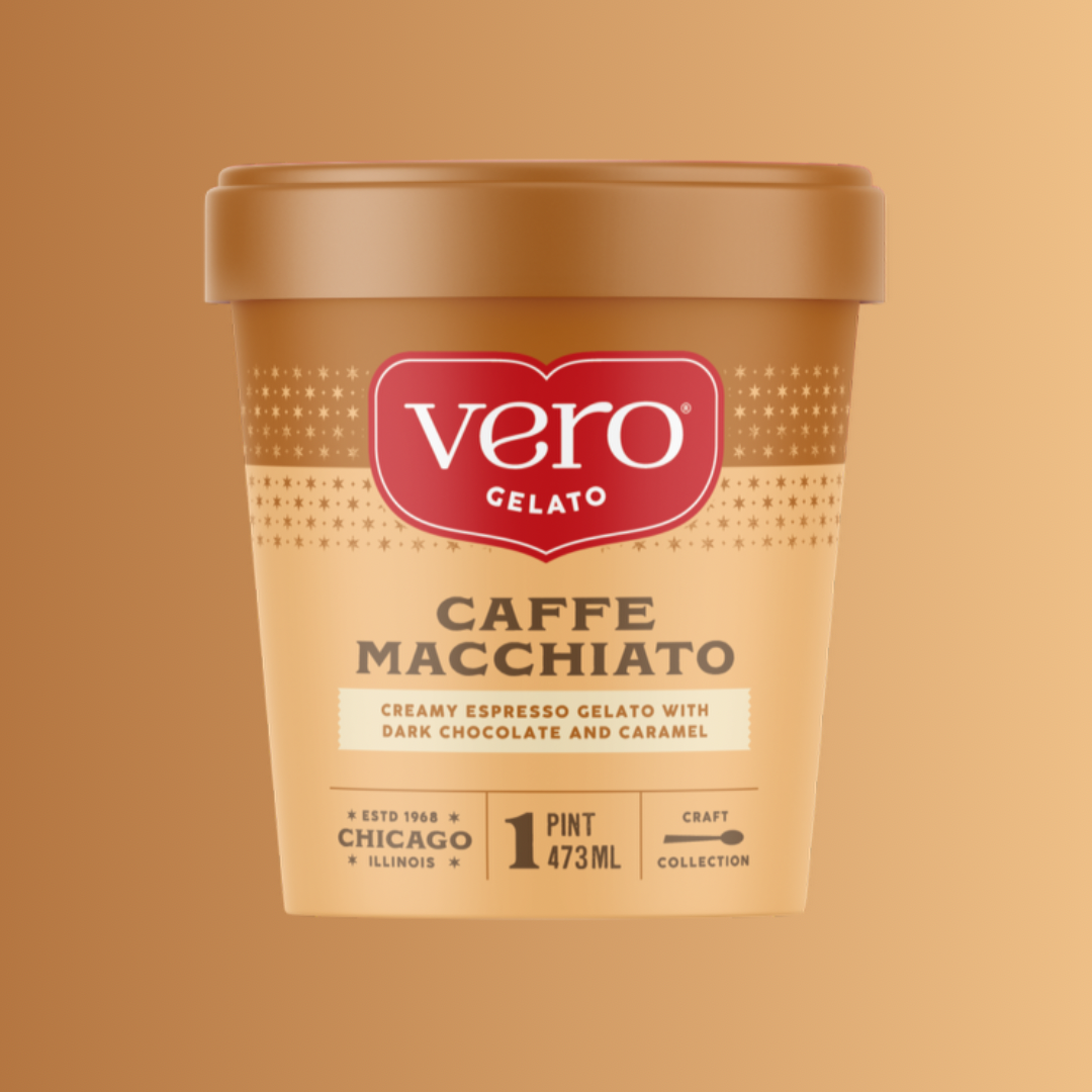 Creamy espresso gelato with rich caramel and dark chocolate swirled in