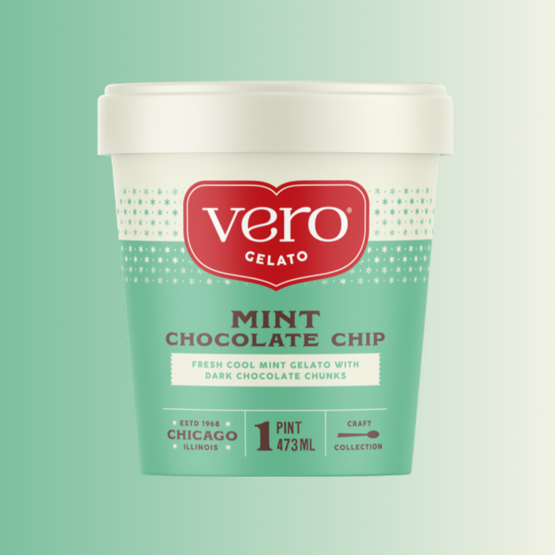 Sweet and cool mint gelato with rich dark chocolate chunks variegated in