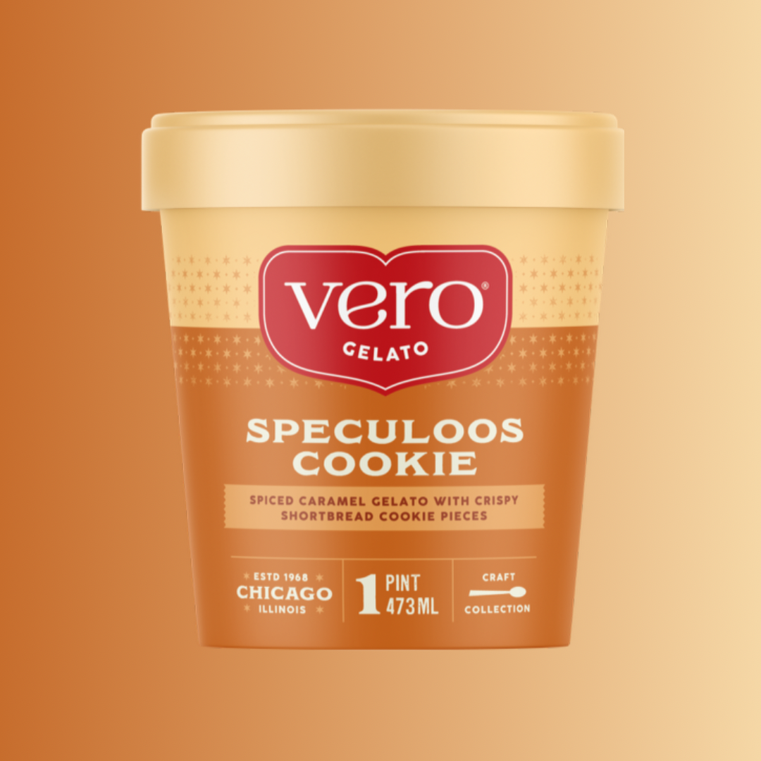 Rich caramel gelato with crispy shortbread cookies and cookie butter swirled in